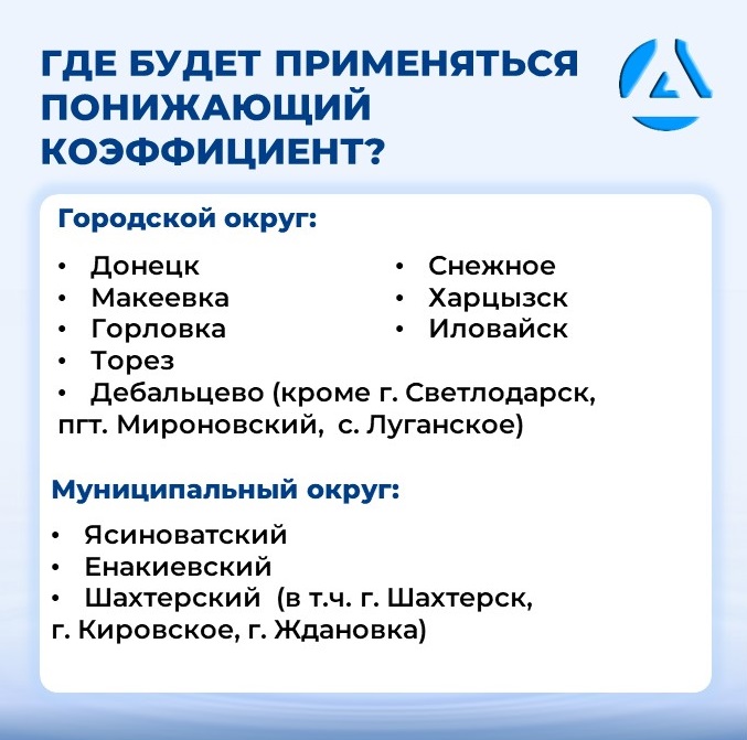 Применение понижающего коэффициента осуществляется с 01.08.2025 в следующих городских округах: Донецк, Макеевка, Горловка, Дебальцево (кроме г. Светлодарск, пгт. Мироновский, с. Луганское), Торез, Снежное, Харцызск, Иловайск и муниципальных округах: Ясиноватский, Енакиевский, Шахтерский (в т.ч. г. Шахтерск, г. Кировское, г. Ждановка), за исключением садоводческих или огороднических некоммерческих товариществ, гаражных кооперативов.